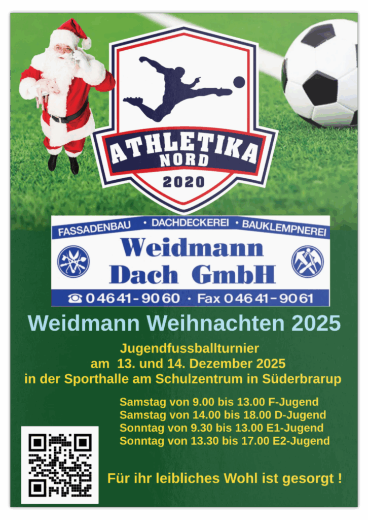 Es ist wieder soweit. Am 13. und 14. Dezember wird unser diesjähriger Weidmann Weihnachten Cup in der Sporthalle am Schulzentrum in Süderbrarup stattfinden. Es treten Mannschaften der Gruppen D, E und F gegeneinander an.